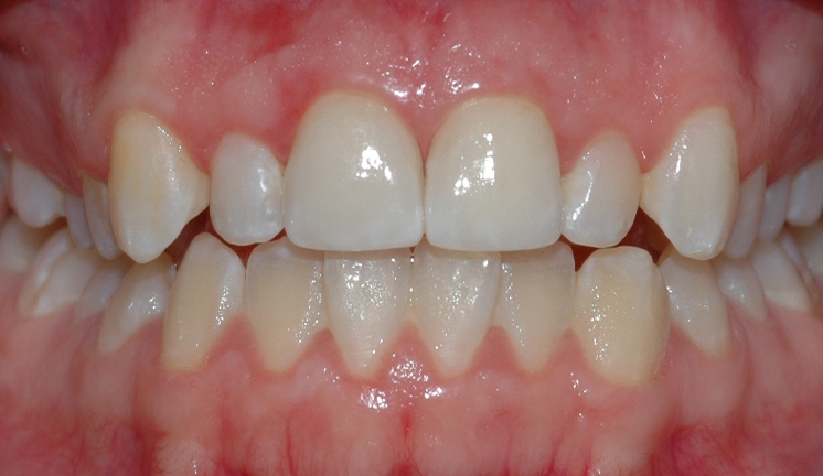 Bildet viser fortenner med utette fyllinger, frakturer og slitasjeskader som følge av tanngnissing.