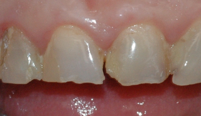 Bildet viser to fortenner som har skjemmende plastfyllinger. Fyllingene er misfarget og har utilfredsstillende estetikk.