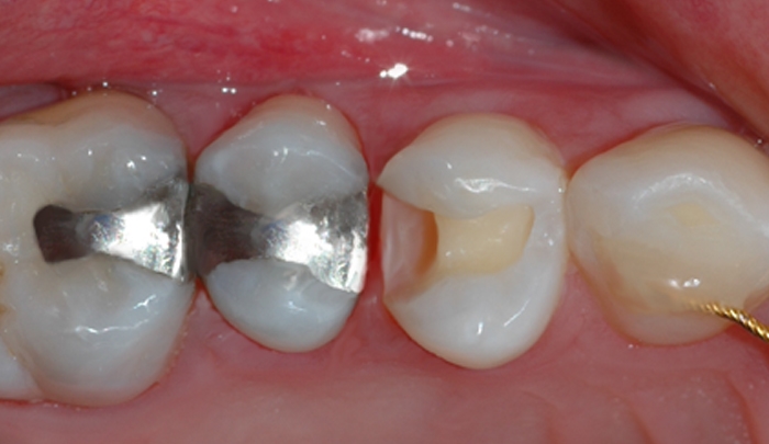 1. Her ser vi et eksempel med en tann der kariesangrepet går inn i dentinet. På grunn av størrelsen, kan det ikke stoppes med grundig renhold og ekstra fluor. Det er derfor nødvendig å reparere tannen med en fylling.
