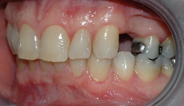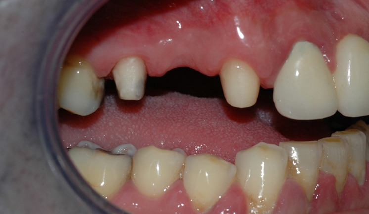 Bildet viser en manglende tann i overkjeven. Nabotennene har fyllinger og tilfellet egner seg derfor godt for brobehandling.