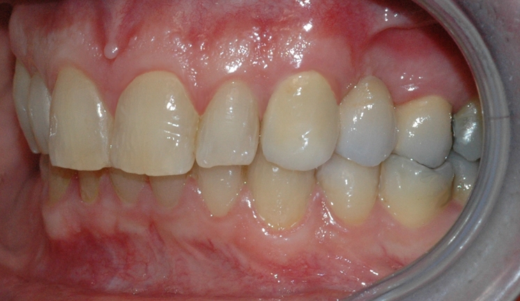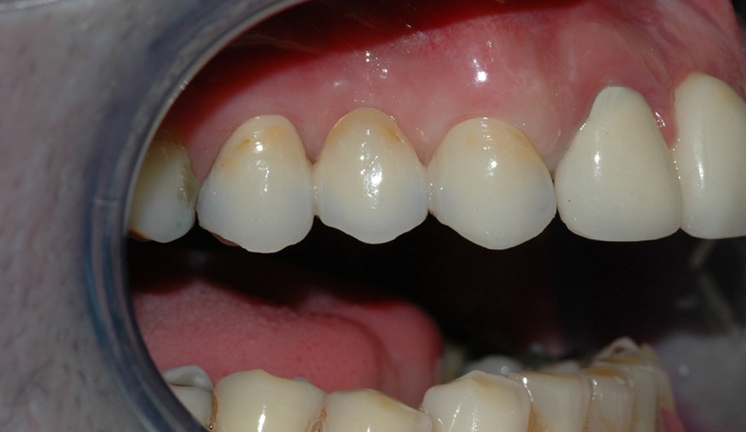 Bildet viser en manglende tann i overkjeven. Nabotennene har fyllinger og slitasje, og tilfellet egner seg derfor godt for brobehandling.